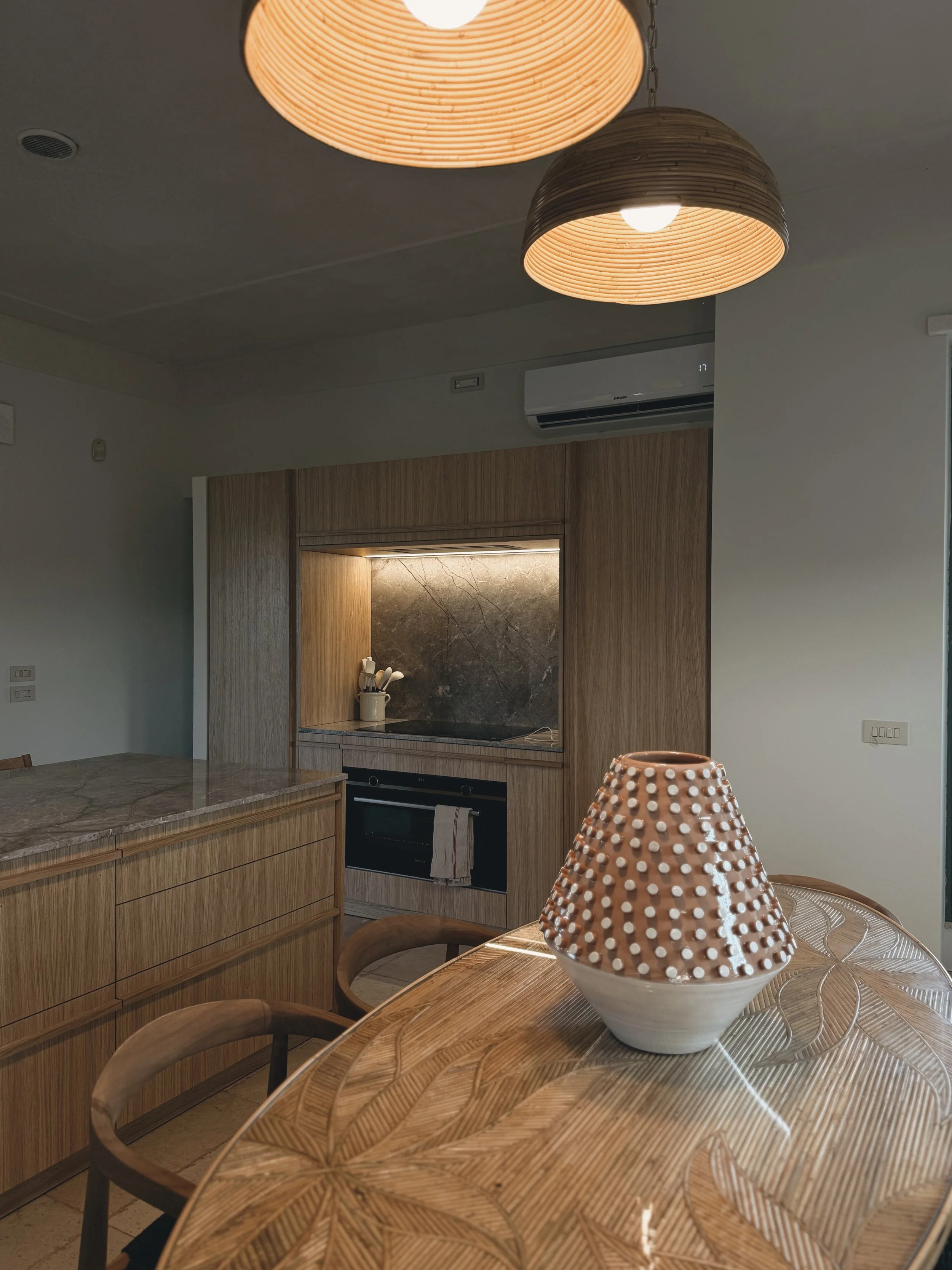 The kitchen is defined by refined materials: a polished Silver Root marble surface that captures and reflects the light with elegance, paired with the natural warmth of oak wood. Together, they create a harmonious dialogue between sophistication and authenticity.